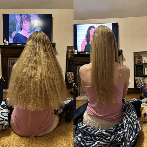 Après 2 mois et demi d’utilisation, je perds beaucoup moins de cheveux qu’avant et je commence à voir de tout petits cheveux repousser près de mes tempes. C’est encourageant et ça me motive à continuer !